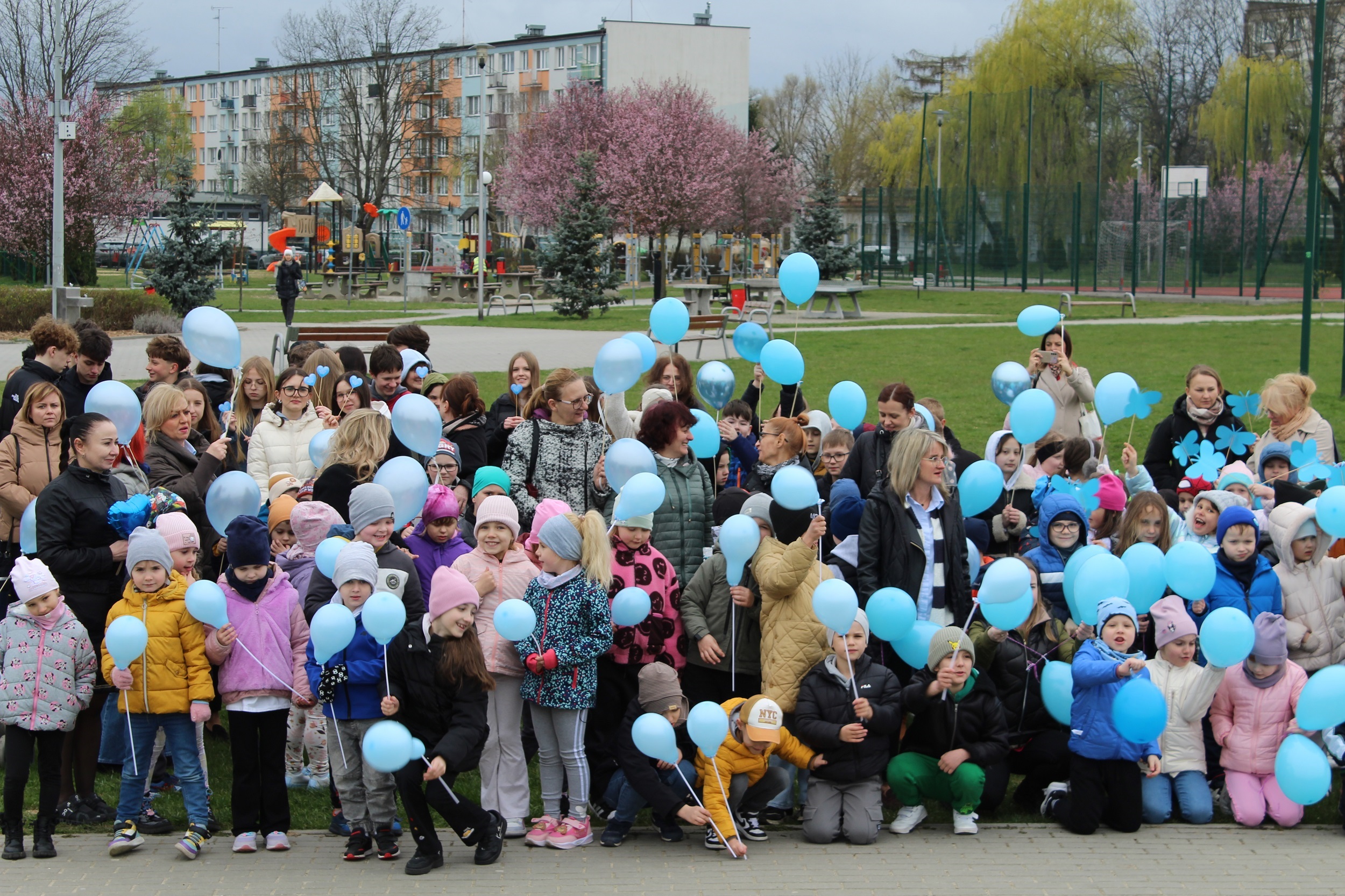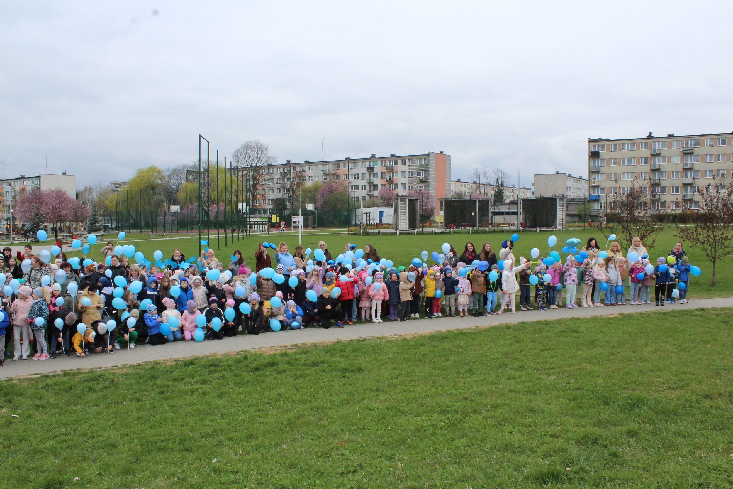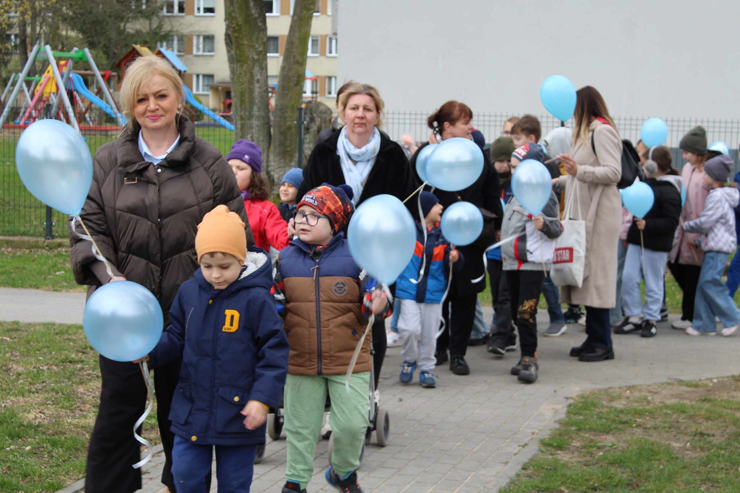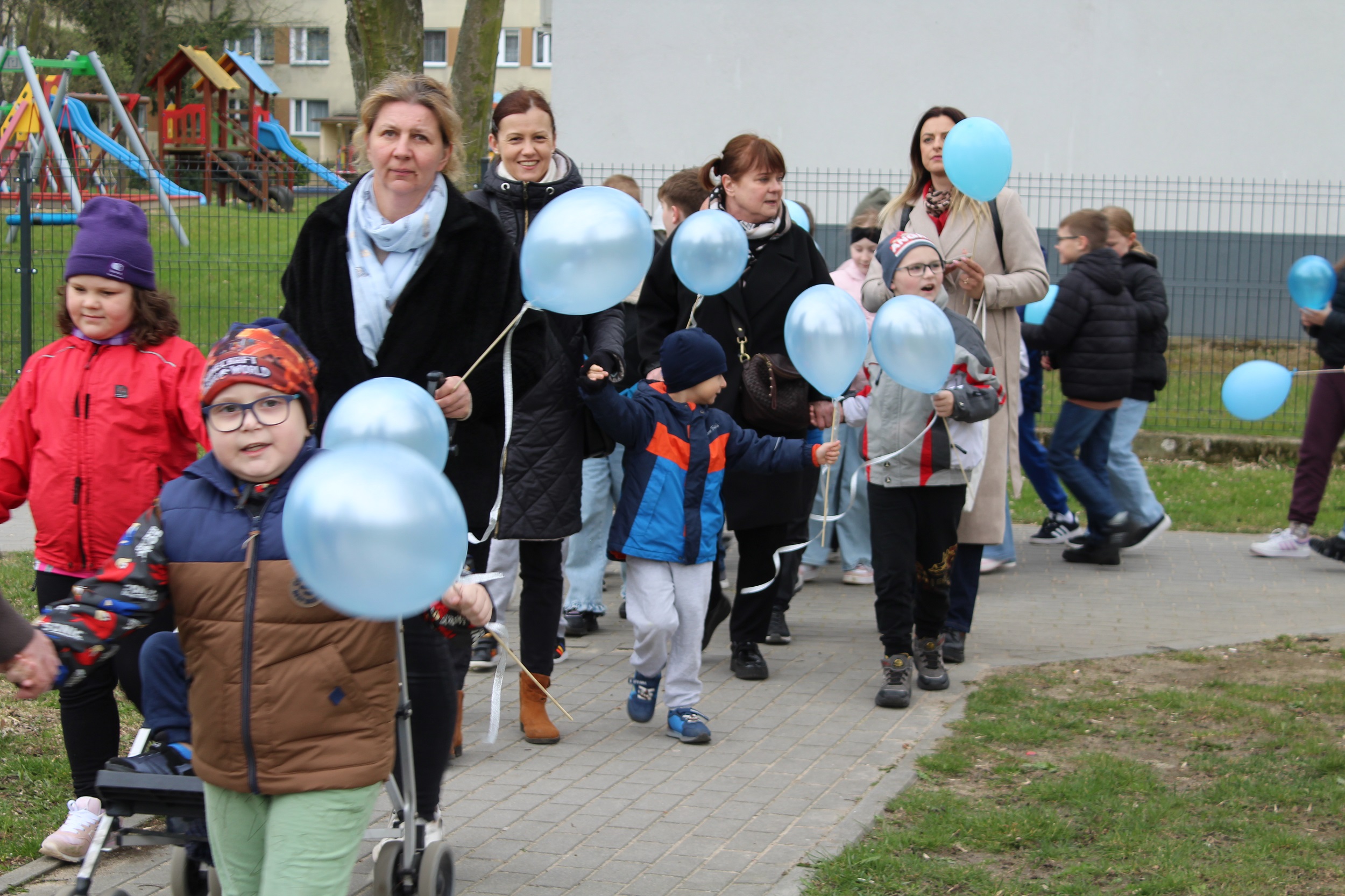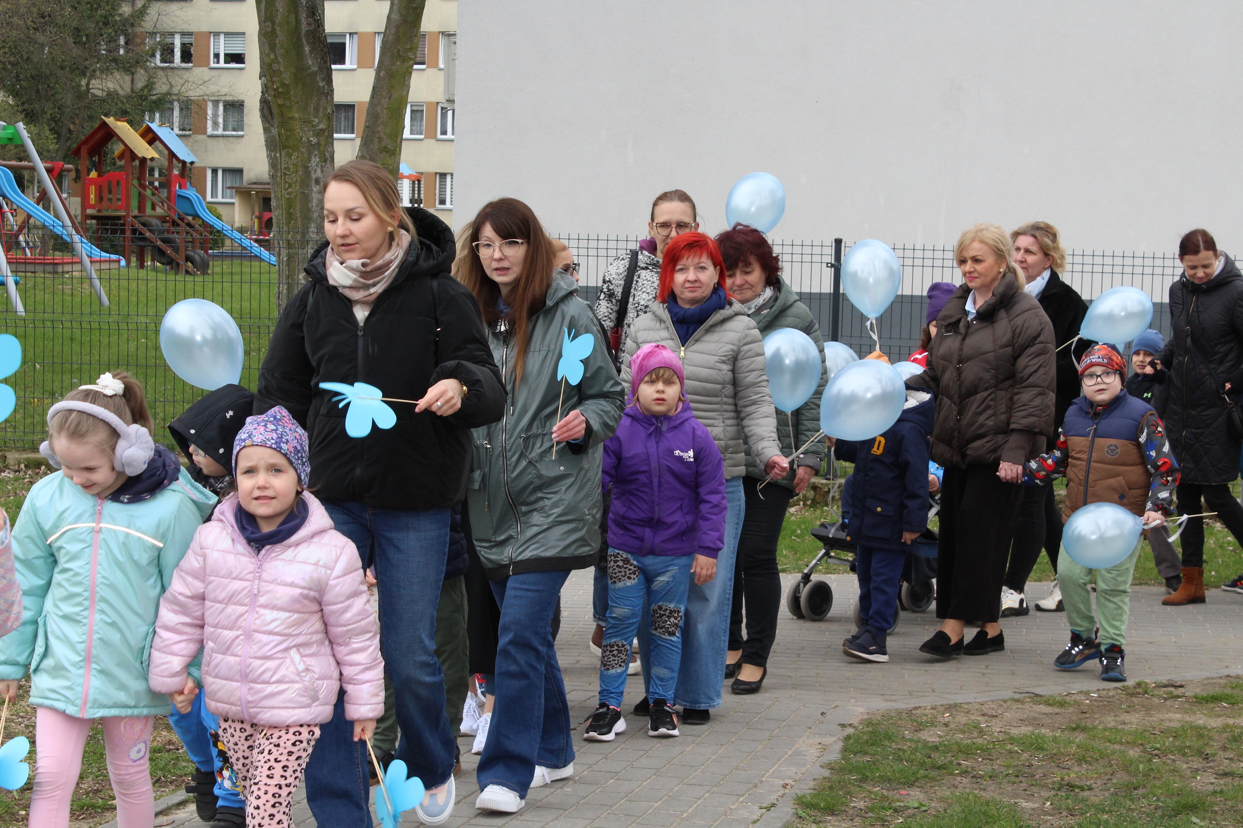 Choć pogoda nas nie rozpieszczała - było pochmurno i chłodno - atmosfera od samego początku była gorąca i pełna wzajemnej życzliwości. Spotkanie rozpoczęliśmy od wspólnego odśpiewania piosenki „Błękitne serca”, po czym dumnie wyruszyliśmy na przemarsz w okolicach przedszkola. Naszym znakiem rozpoznawczym były niebieskie balony oraz papierowe motyle, które niosły dzieci , symbolizując solidarność z osobami w spektrum autyzmu. Na zakończenie wykonaliśmy pamiątkowe zdjęcia, które będą pięknym wspomnieniem tego pełnego jedności dnia.