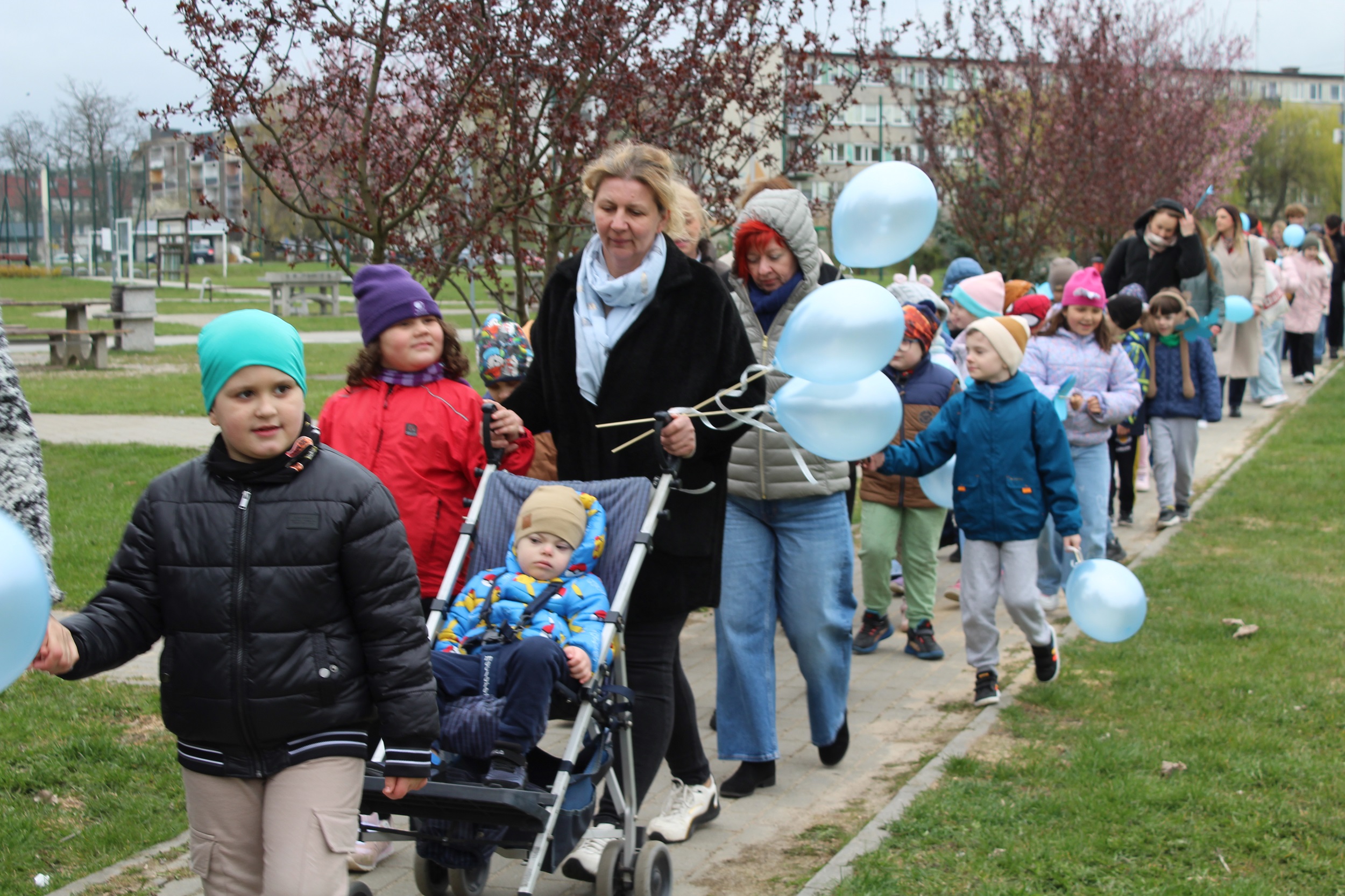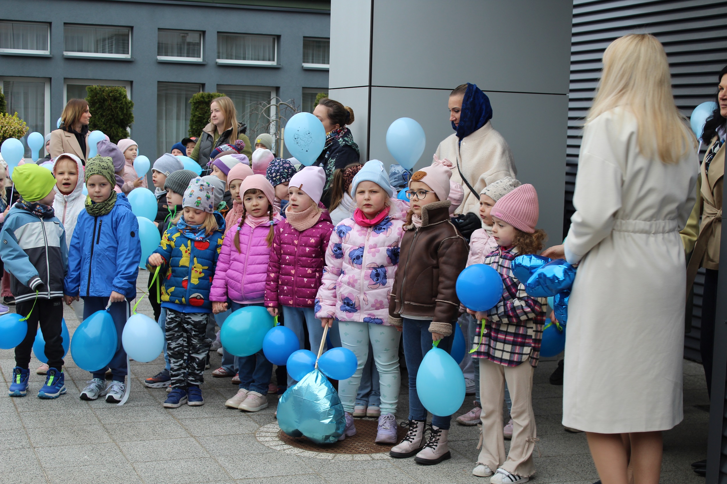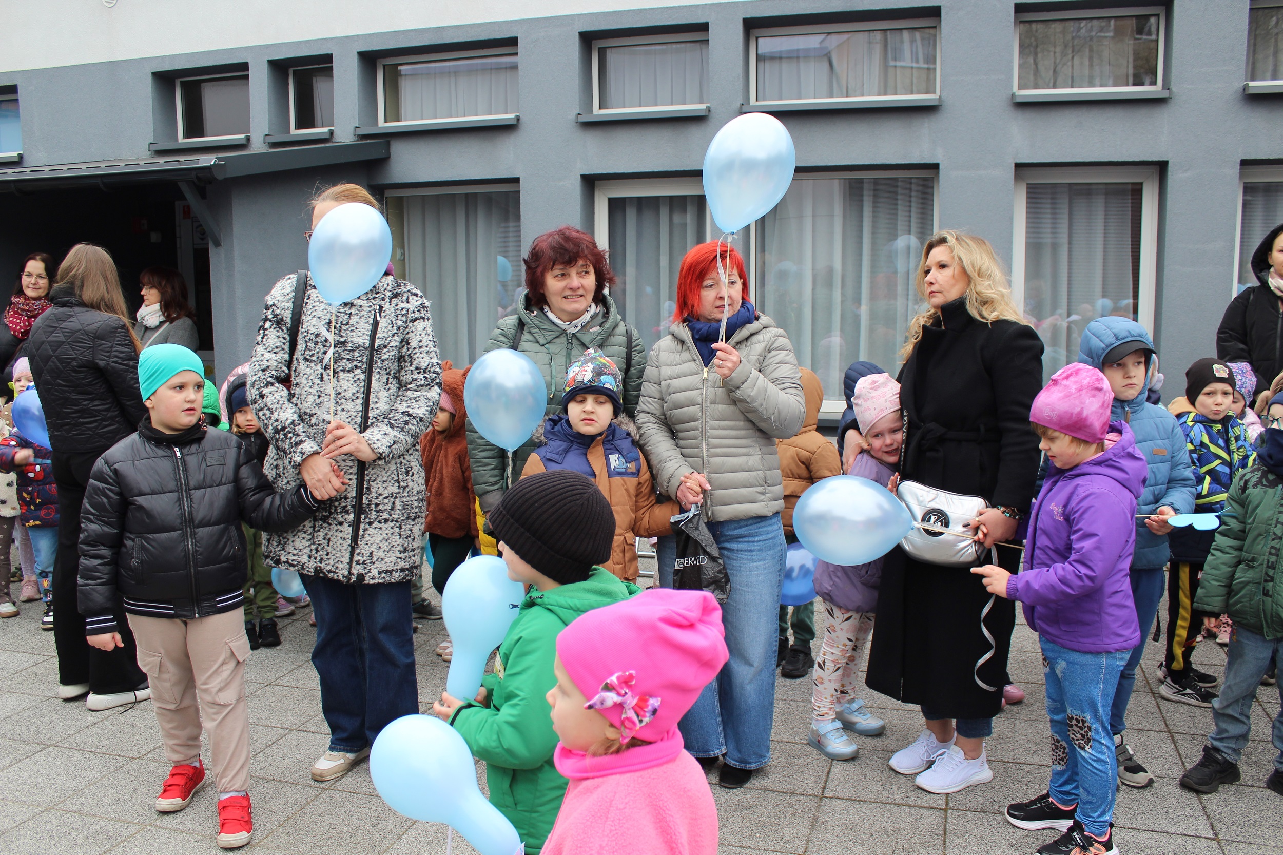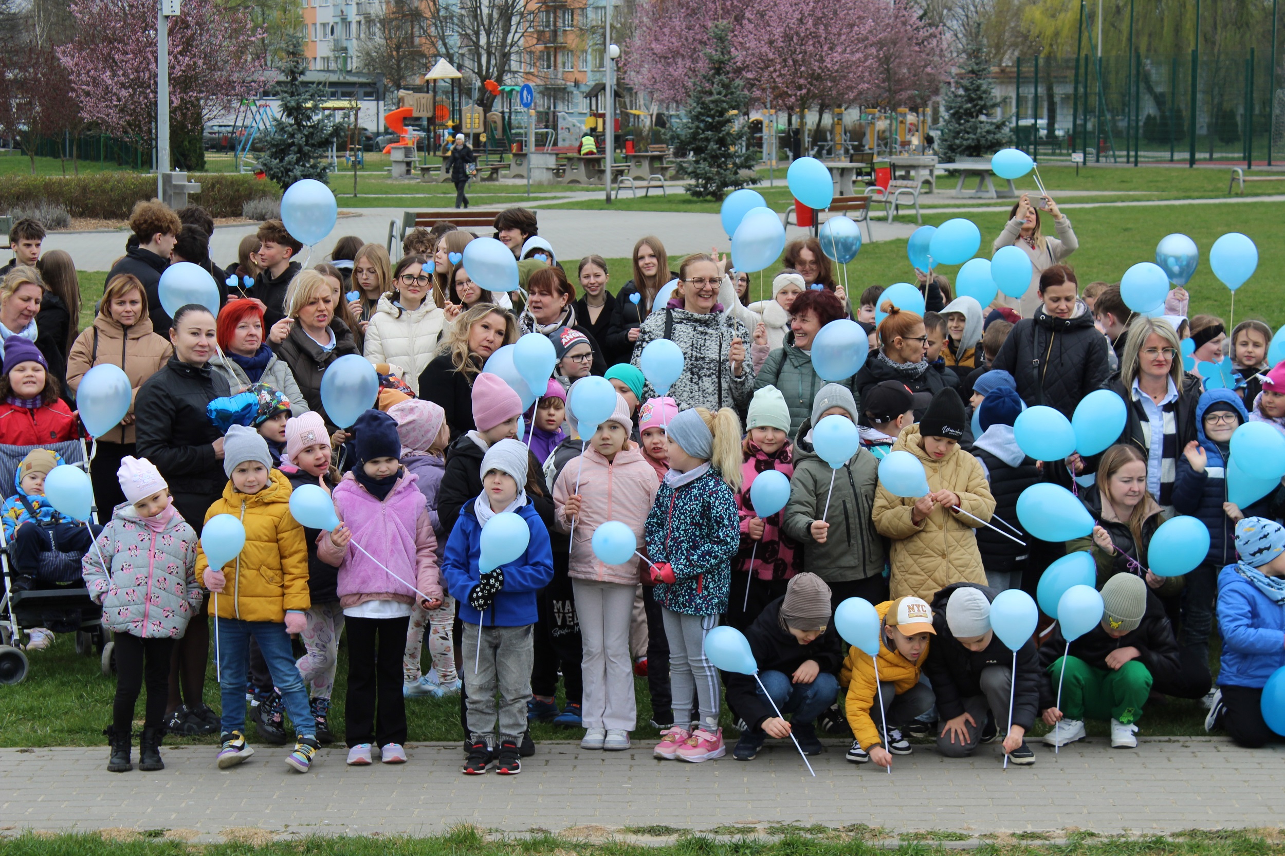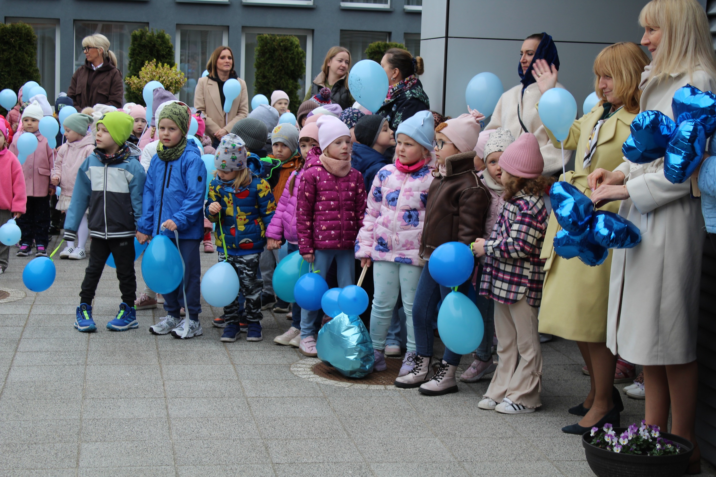 Choć pogoda nas nie rozpieszczała - było pochmurno i chłodno - atmosfera od samego początku była gorąca i pełna wzajemnej życzliwości. Spotkanie rozpoczęliśmy od wspólnego odśpiewania piosenki „Błękitne serca”, po czym dumnie wyruszyliśmy na przemarsz w okolicach przedszkola. Naszym znakiem rozpoznawczym były niebieskie balony oraz papierowe motyle, które niosły dzieci , symbolizując solidarność z osobami w spektrum autyzmu. Na zakończenie wykonaliśmy pamiątkowe zdjęcia, które będą pięknym wspomnieniem tego pełnego jedności dnia.