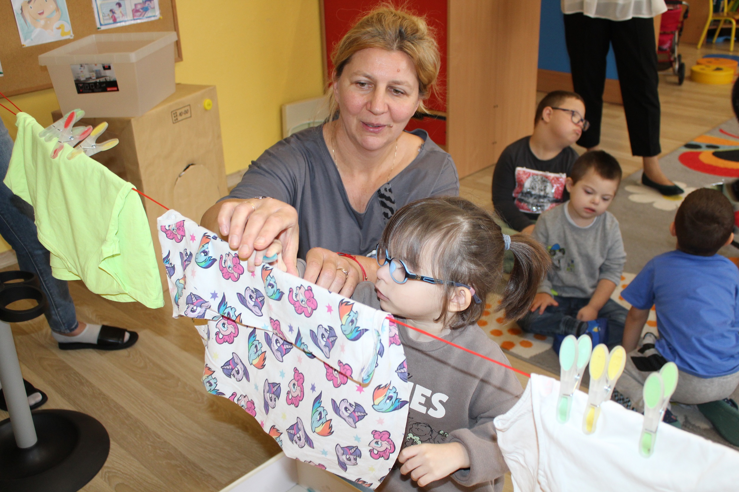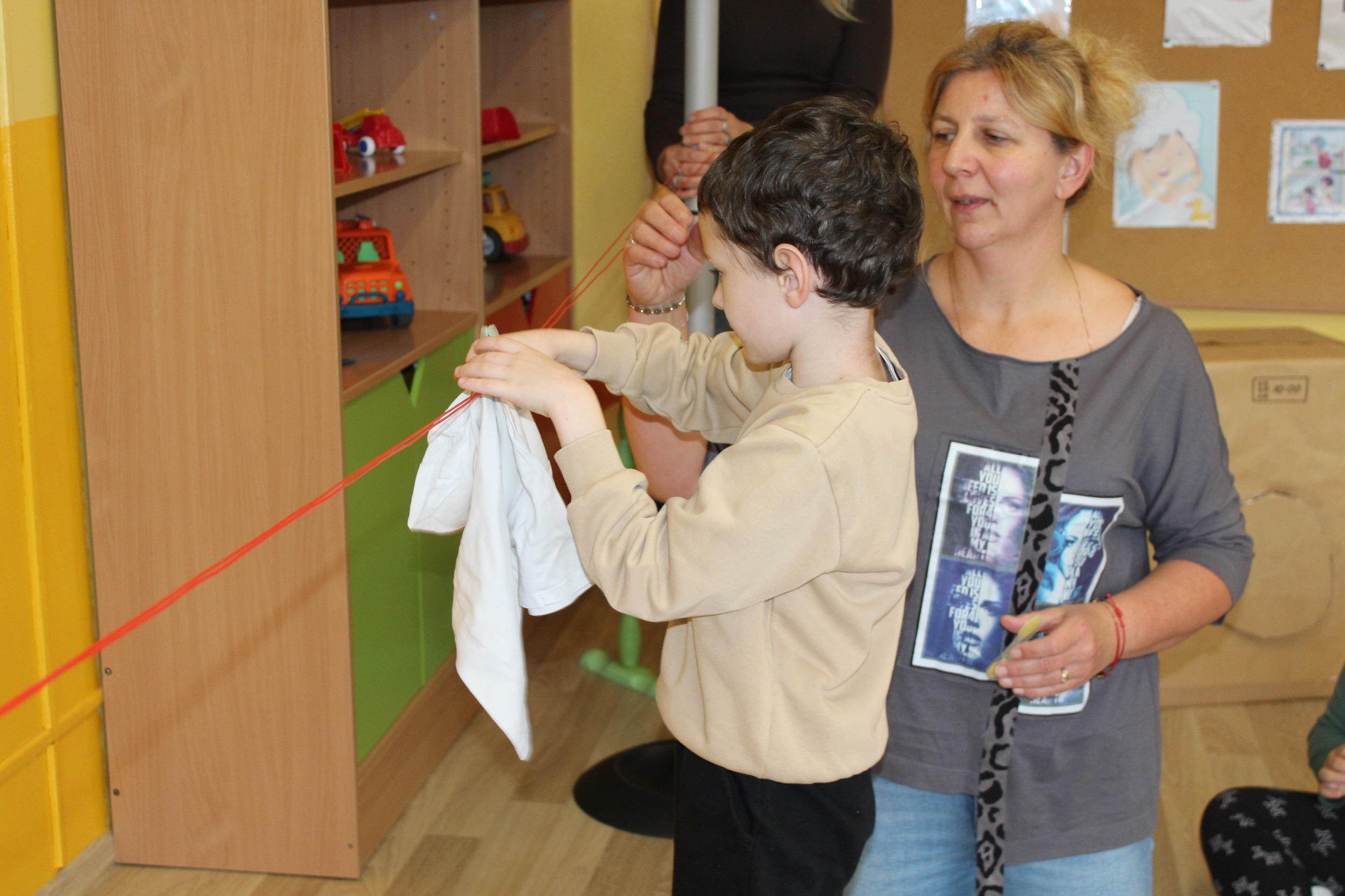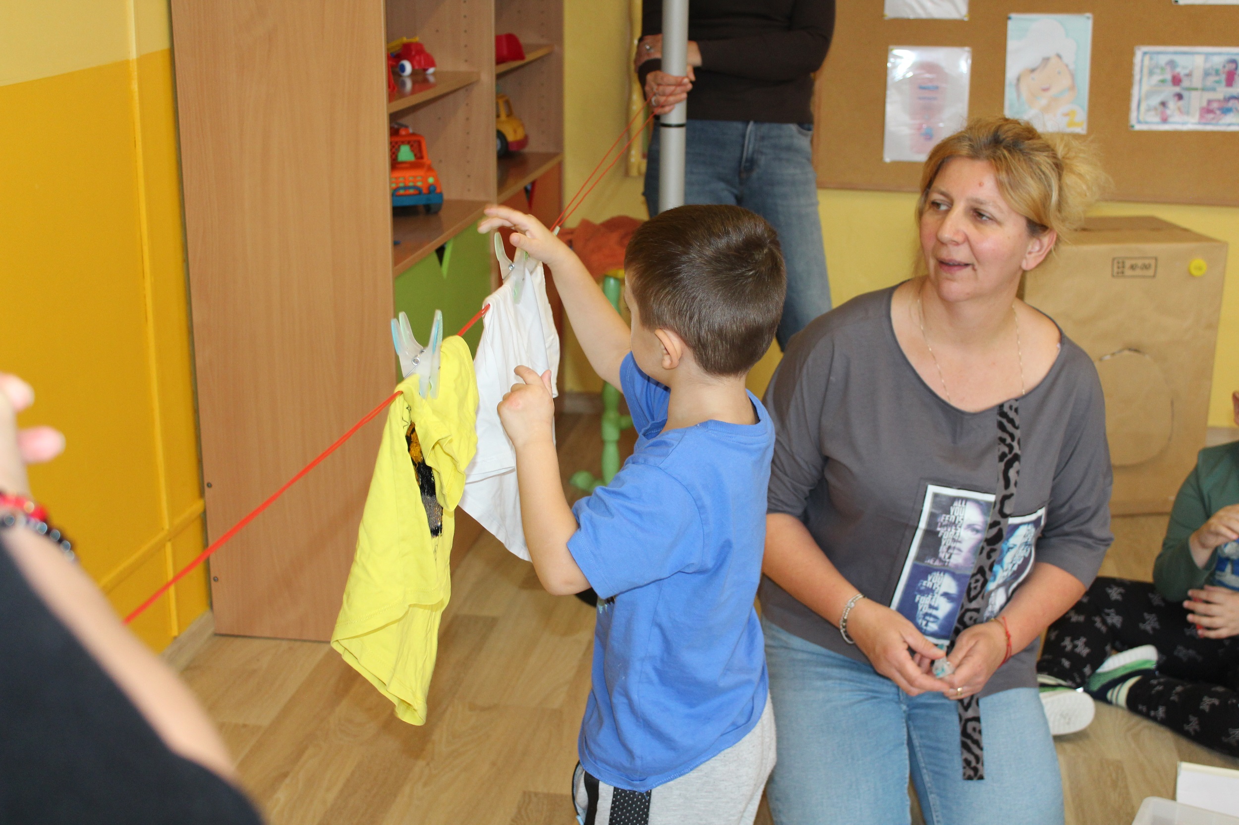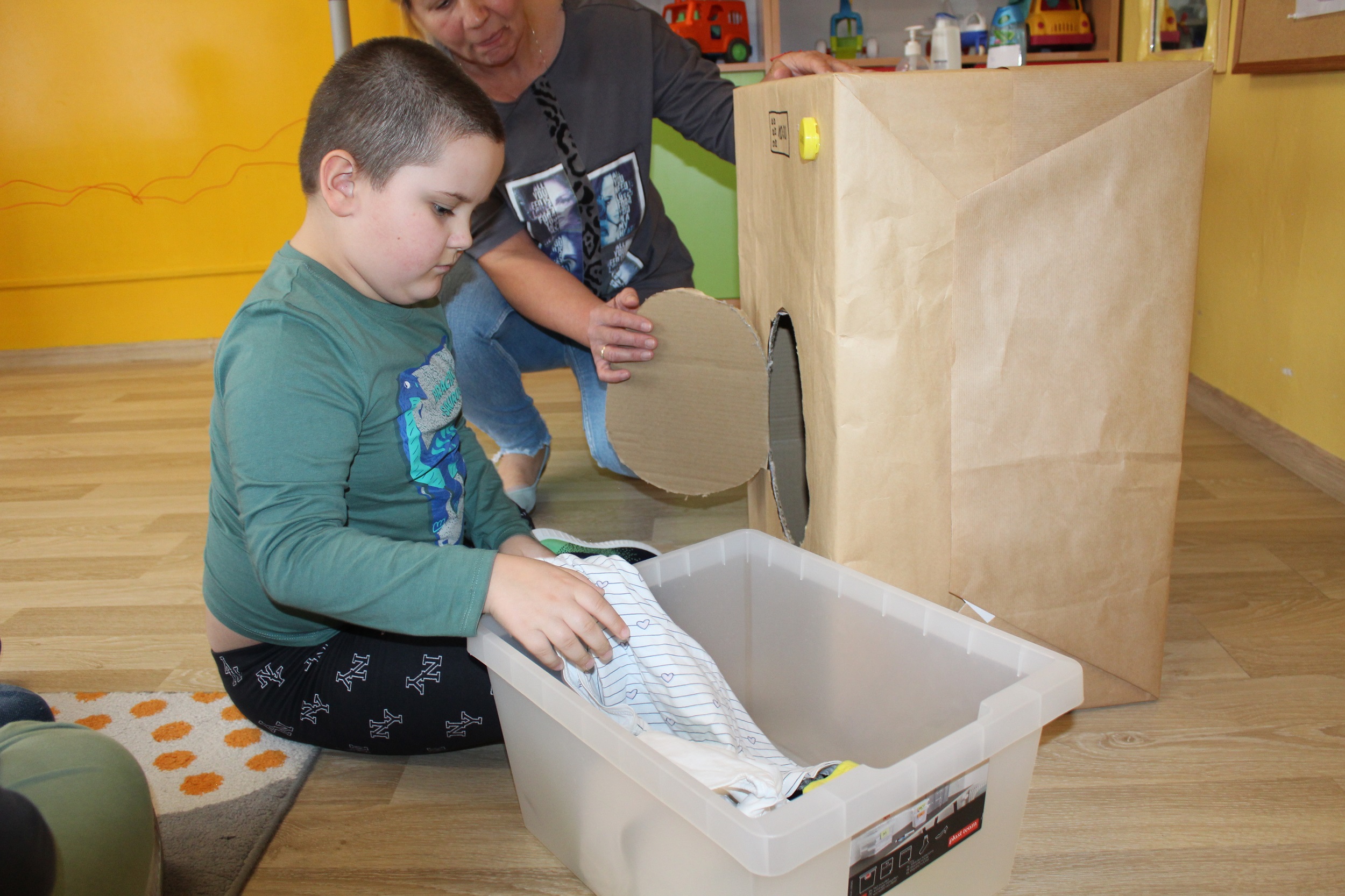 Pierwszy dzień poświęcony był codziennym nawykom higienicznym. Uczestniczyliśmy w zabawach muzyczno - naśladowczych ucząc się prawidłowego mycia rąk i twarzy, śpiewaliśmy piosenkę „Praczki”, a także bawiliśmy się w „Pranie i wieszanie prania” wieszając ubranka na sznurkach. Przygotowana przez p. Agnieszkę kartonowa pralka stała się główną atrakcją zajęć. Podczas zabawy ”Kotek nosek myje” utrwaliliśmy czynności związane z dbaniem o czystość. Rozpoznawaliśmy przybory higieniczne i pokazywaliśmy do czego służą.