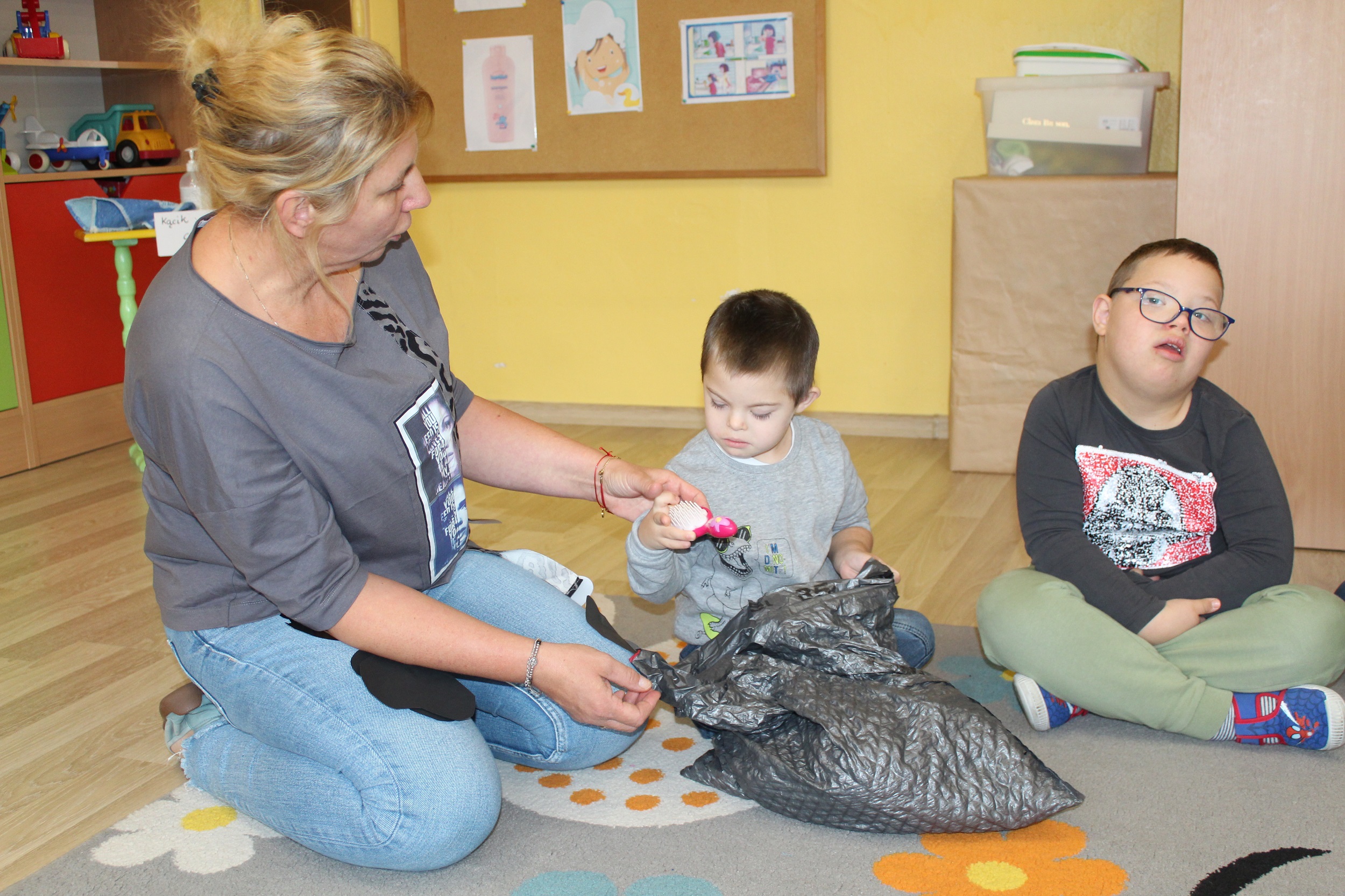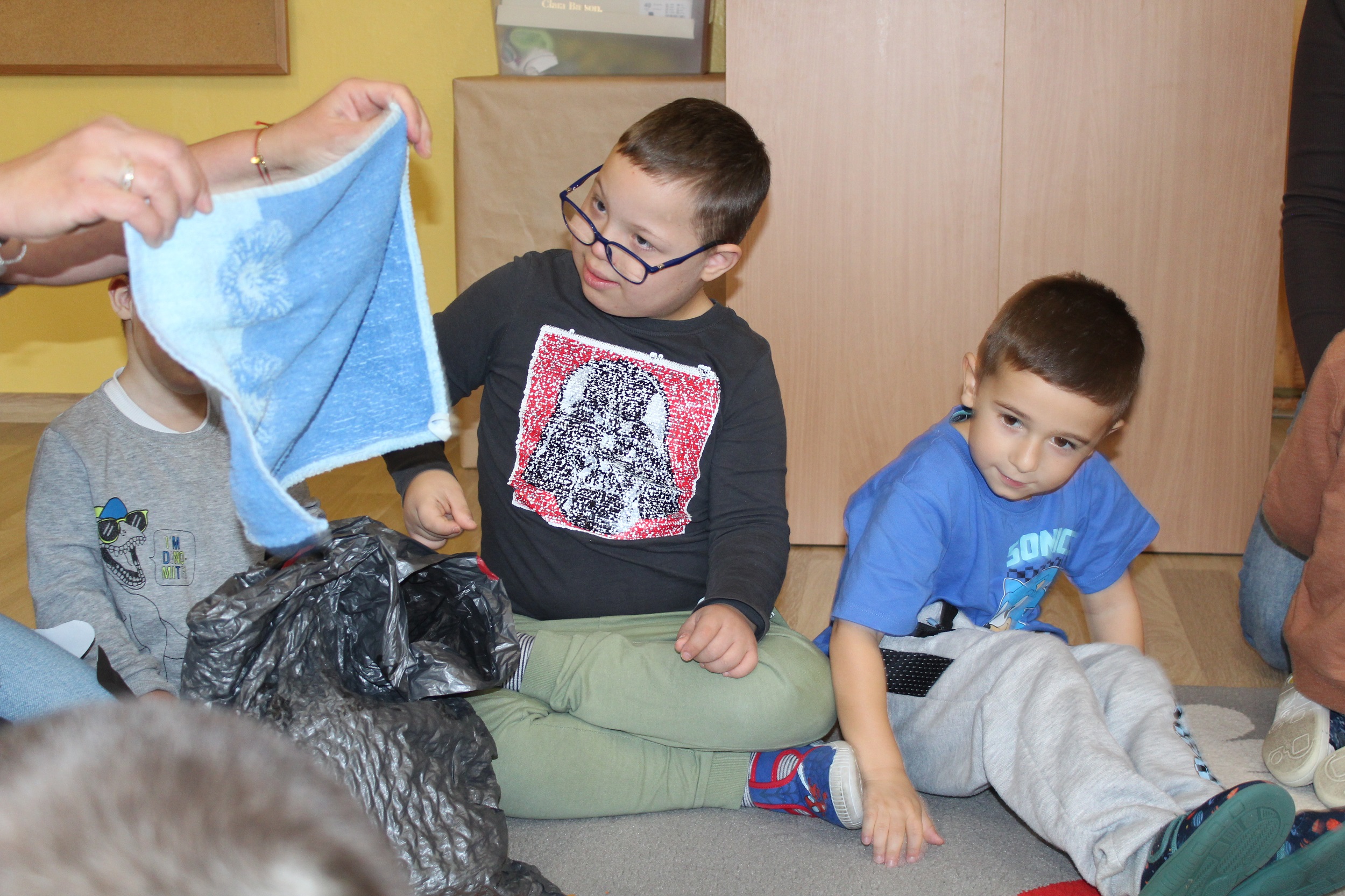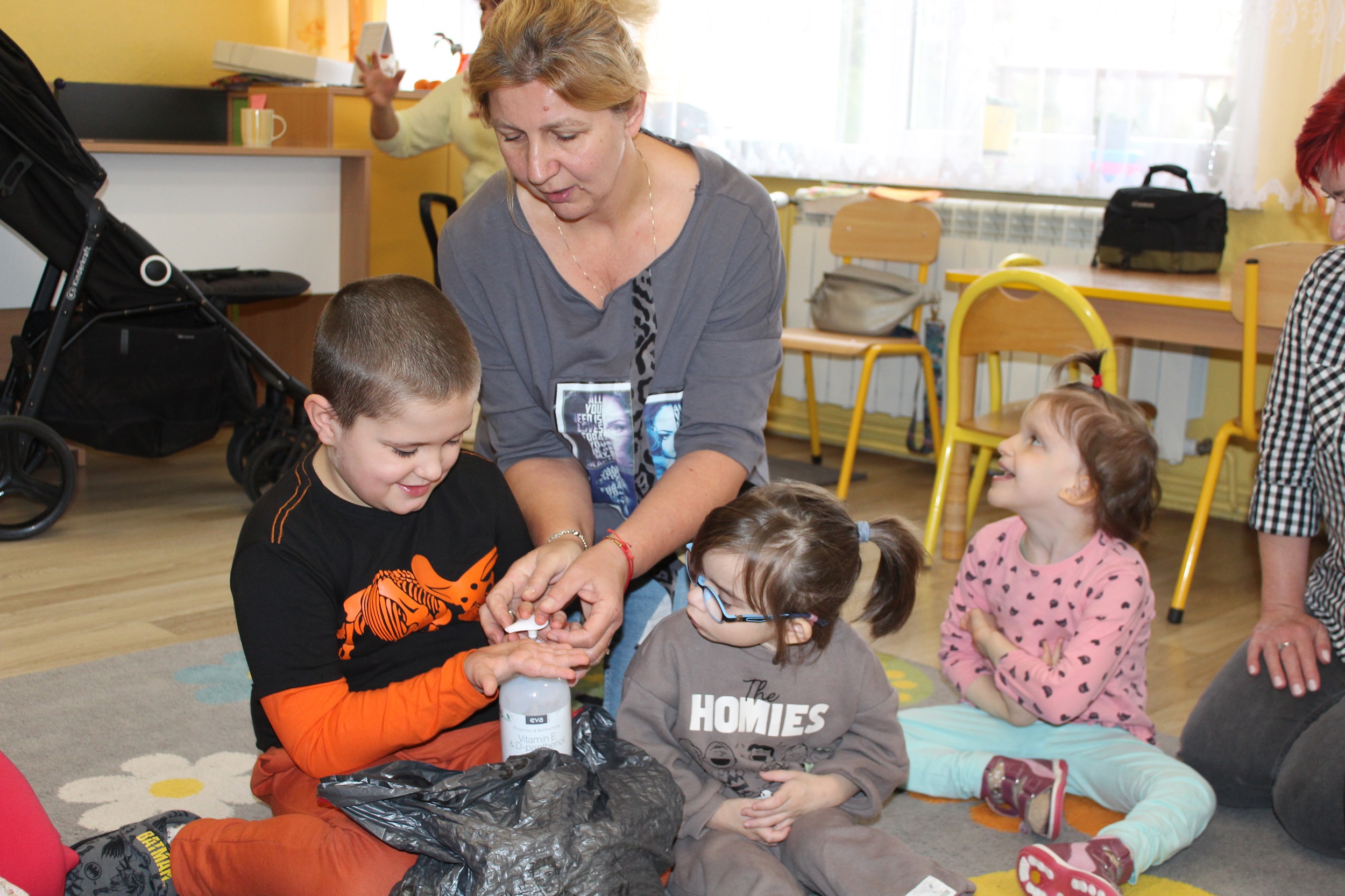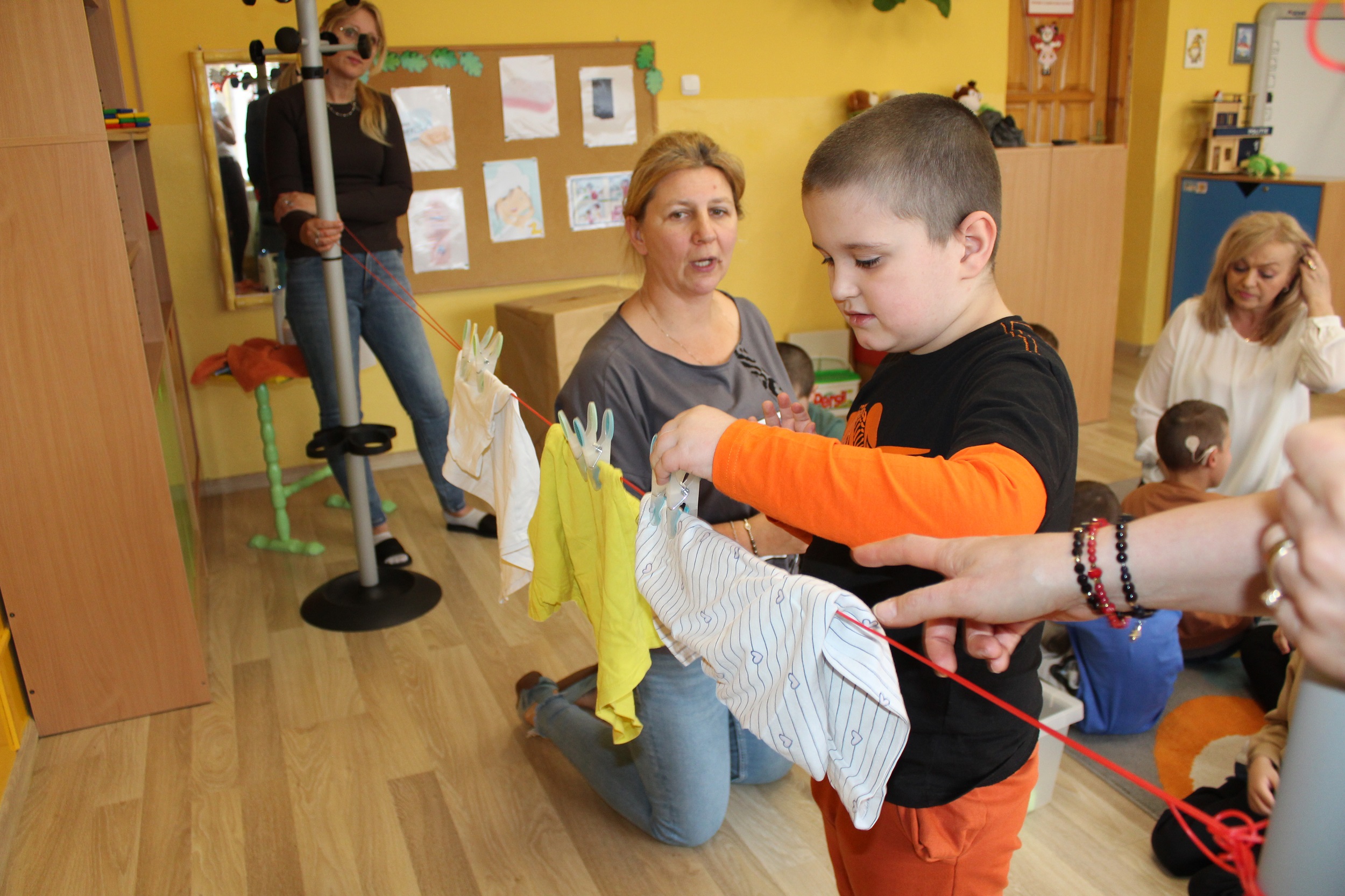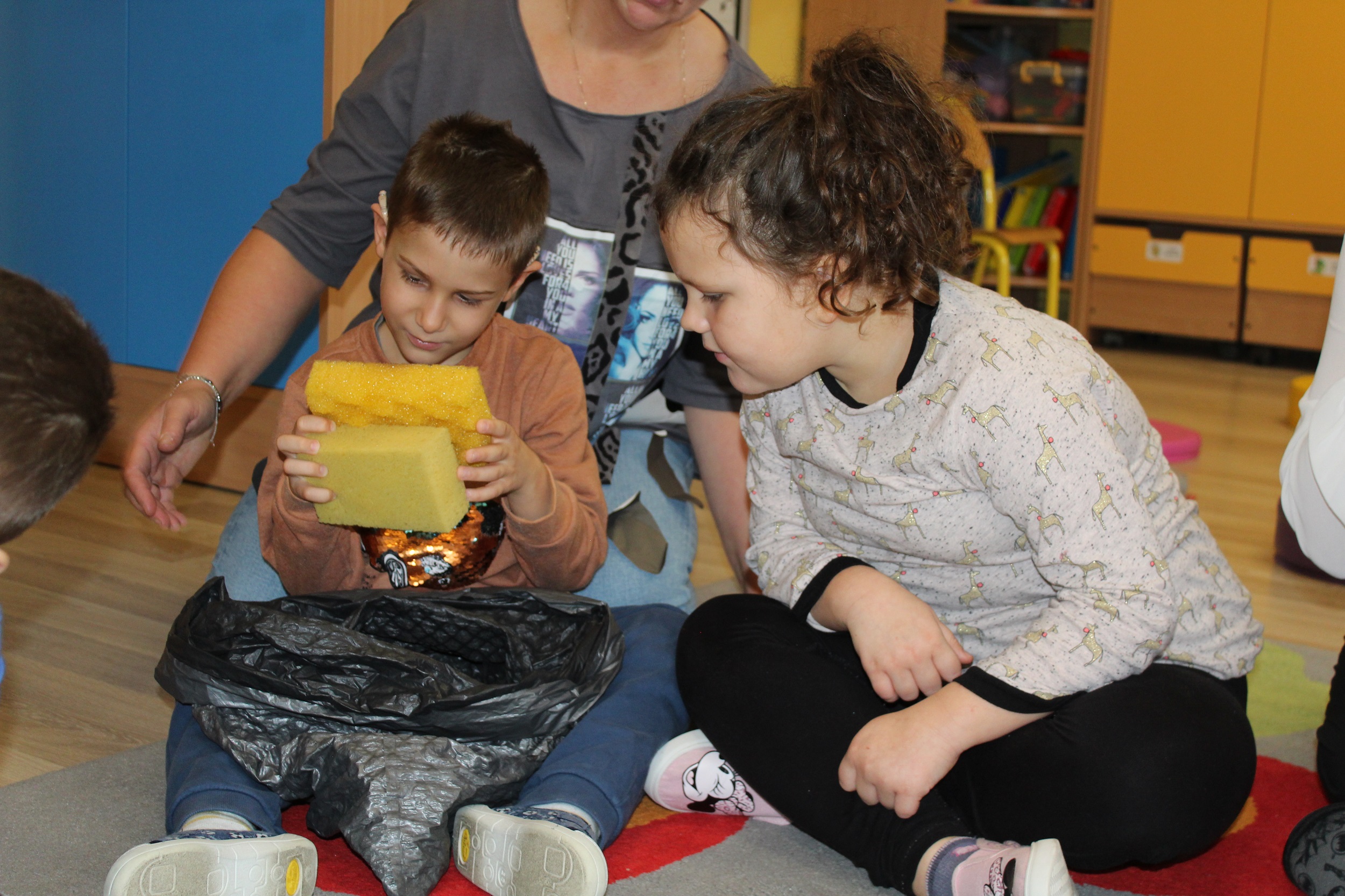 Pierwszy dzień poświęcony był codziennym nawykom higienicznym. Uczestniczyliśmy w zabawach muzyczno - naśladowczych ucząc się prawidłowego mycia rąk i twarzy, śpiewaliśmy piosenkę „Praczki”, a także bawiliśmy się w „Pranie i wieszanie prania” wieszając ubranka na sznurkach. Przygotowana przez p. Agnieszkę kartonowa pralka stała się główną atrakcją zajęć. Podczas zabawy ”Kotek nosek myje” utrwaliliśmy czynności związane z dbaniem o czystość. Rozpoznawaliśmy przybory higieniczne i pokazywaliśmy do czego służą.