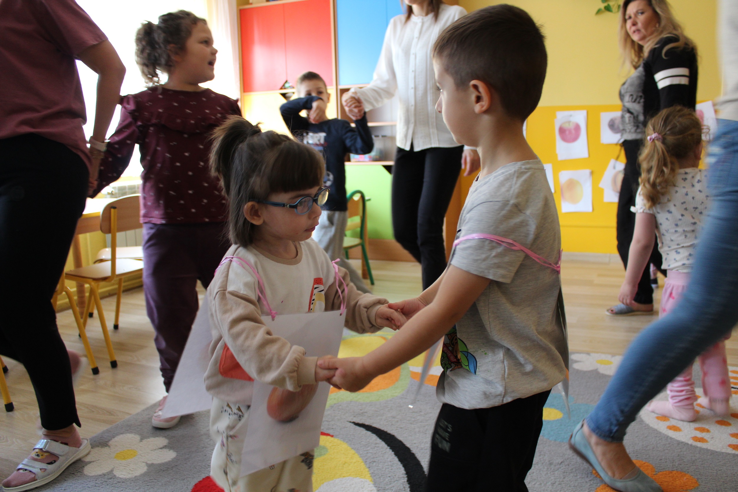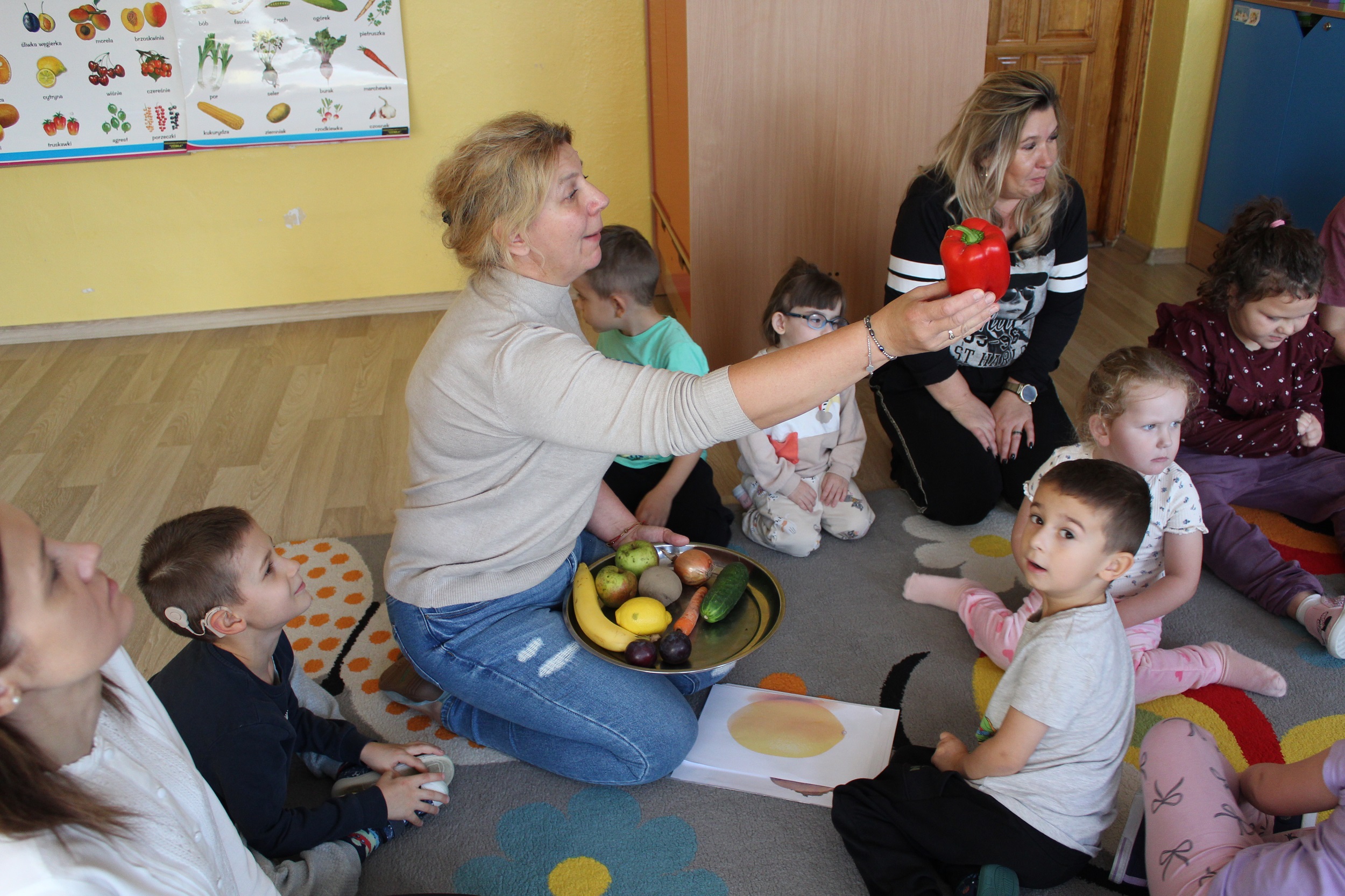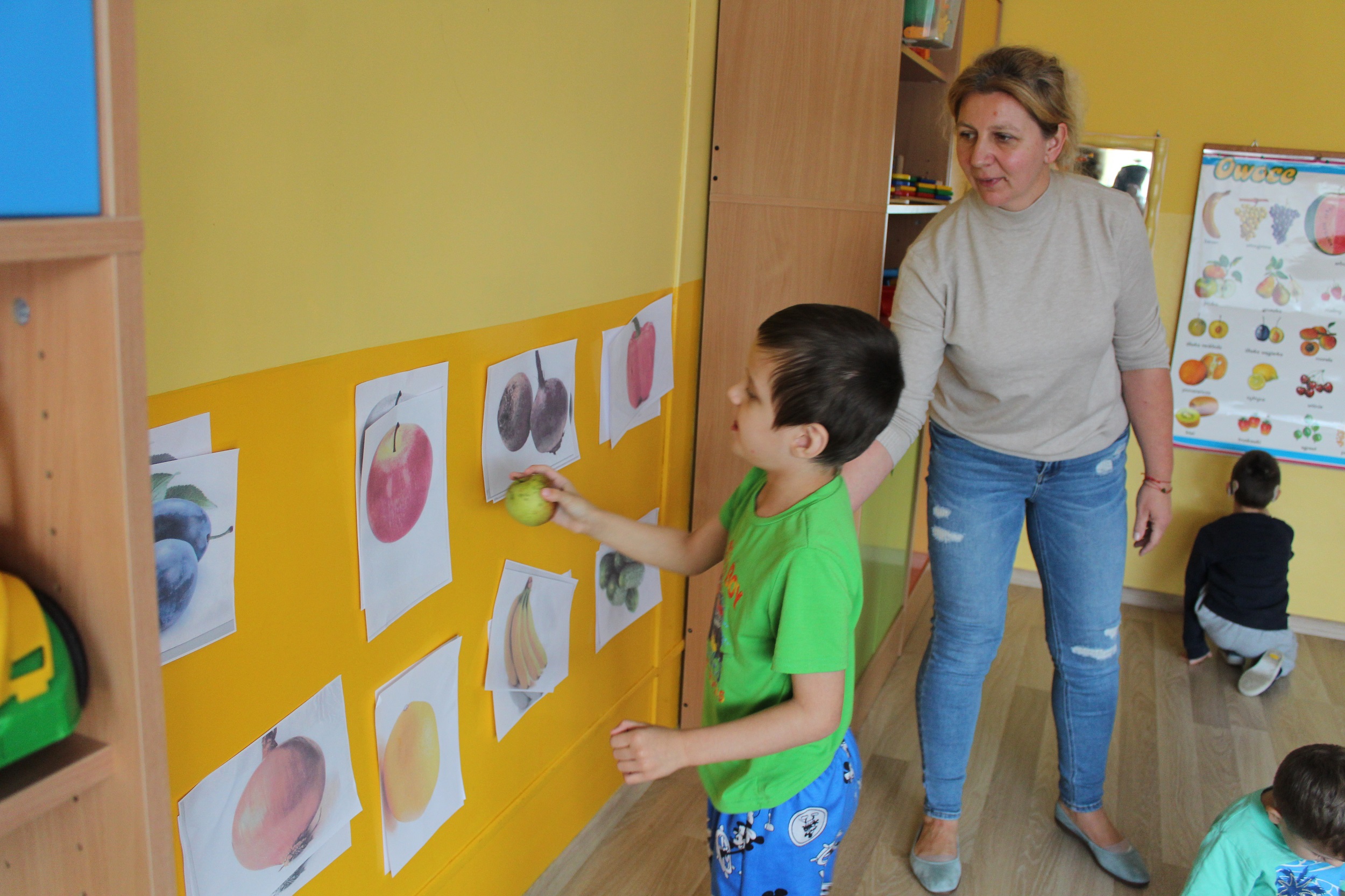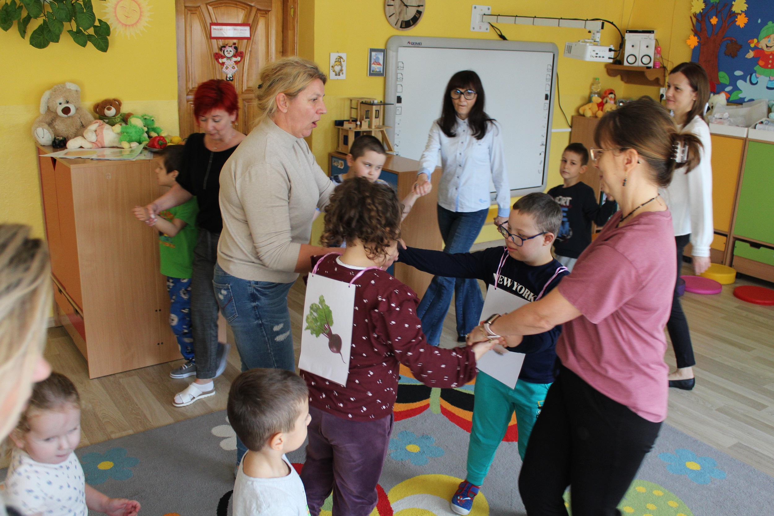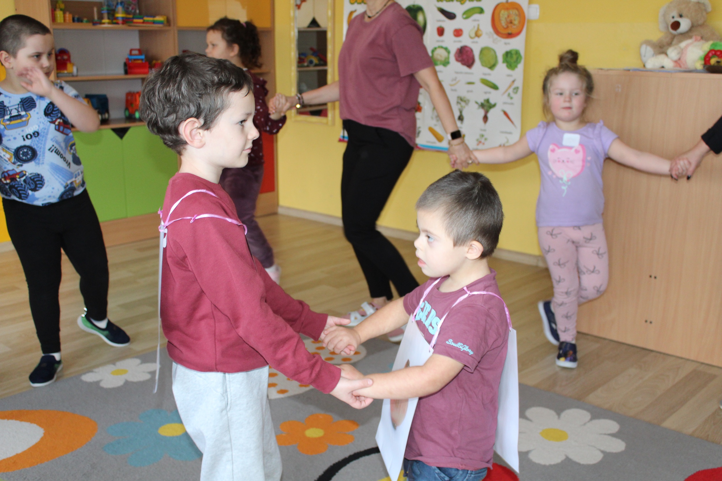 W kolejnym dniu uczestniczyliśmy w zabawach rytmicznych związanych z owocami i warzywami. Przy dźwiękach piosenki „Idą śliwki” uczyliśmy się ruchu i współpracy przy muzyce. Było to połączenie edukacji, ruchu i dobrej zabawy.
