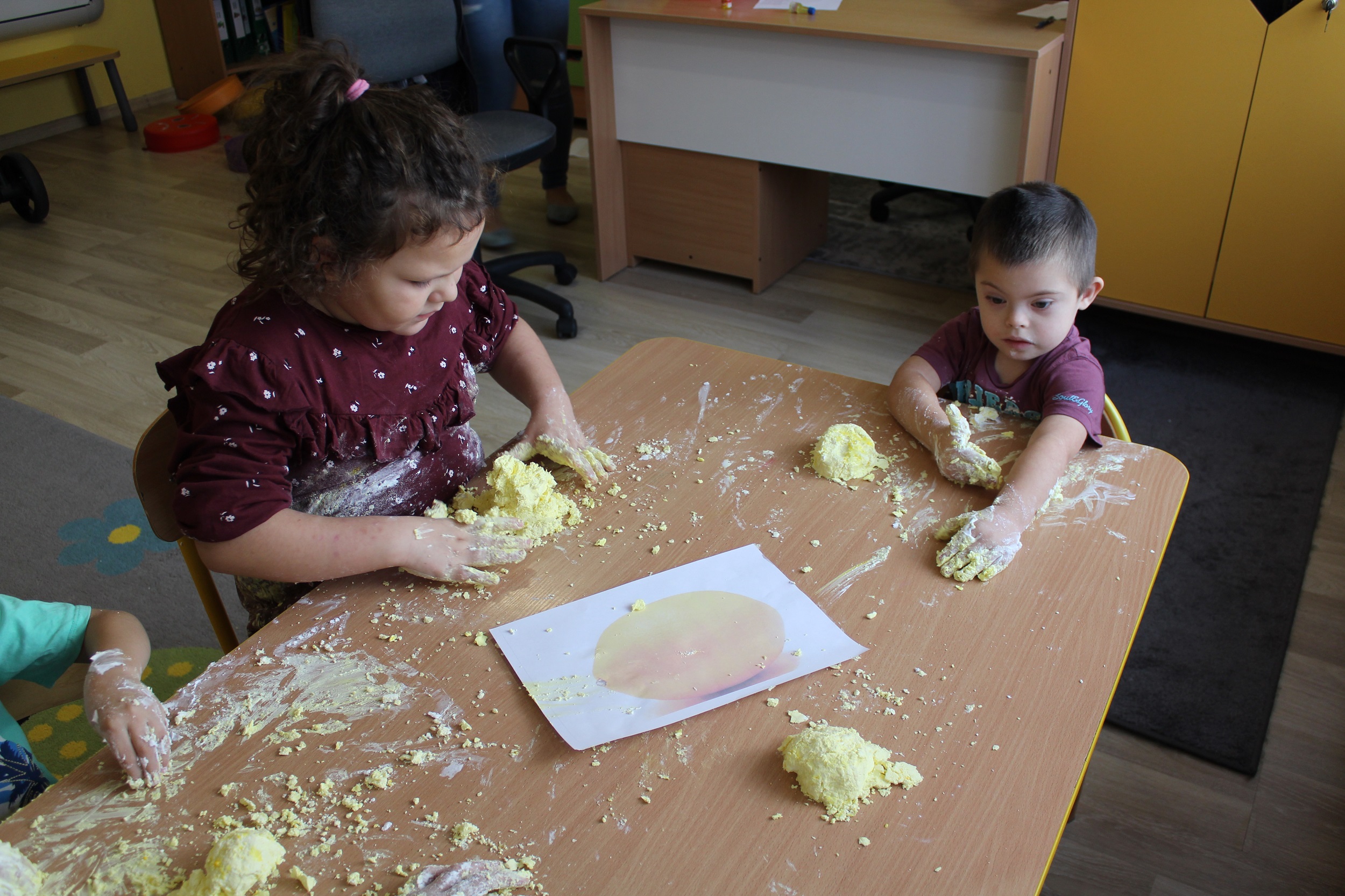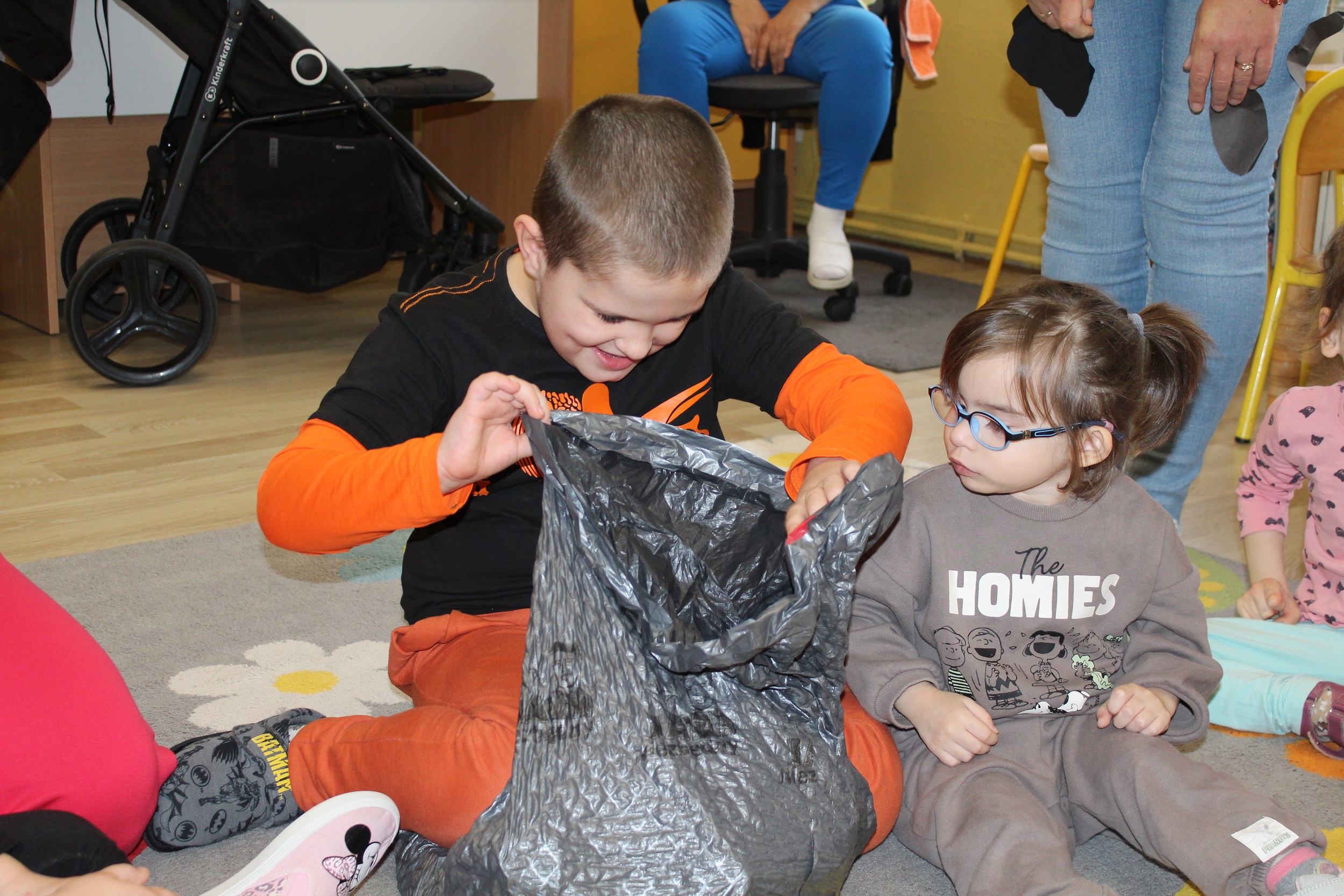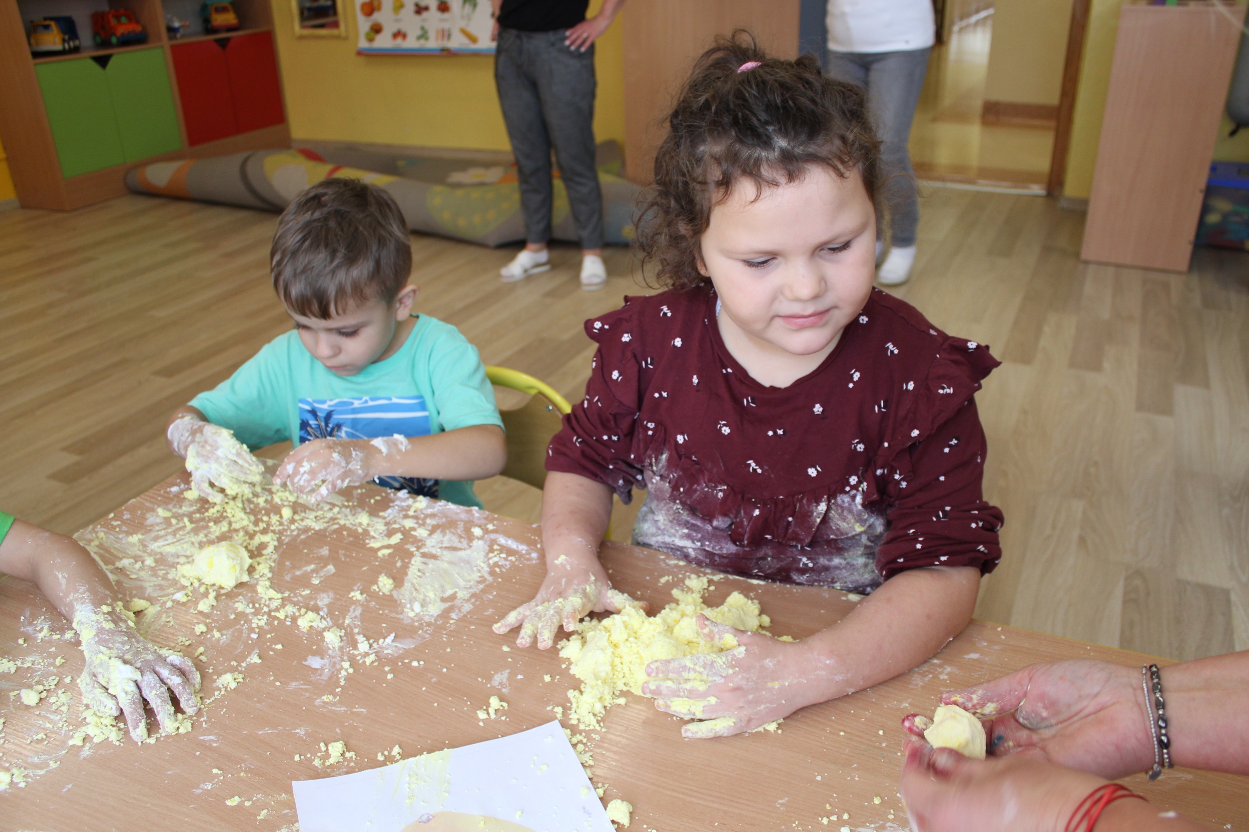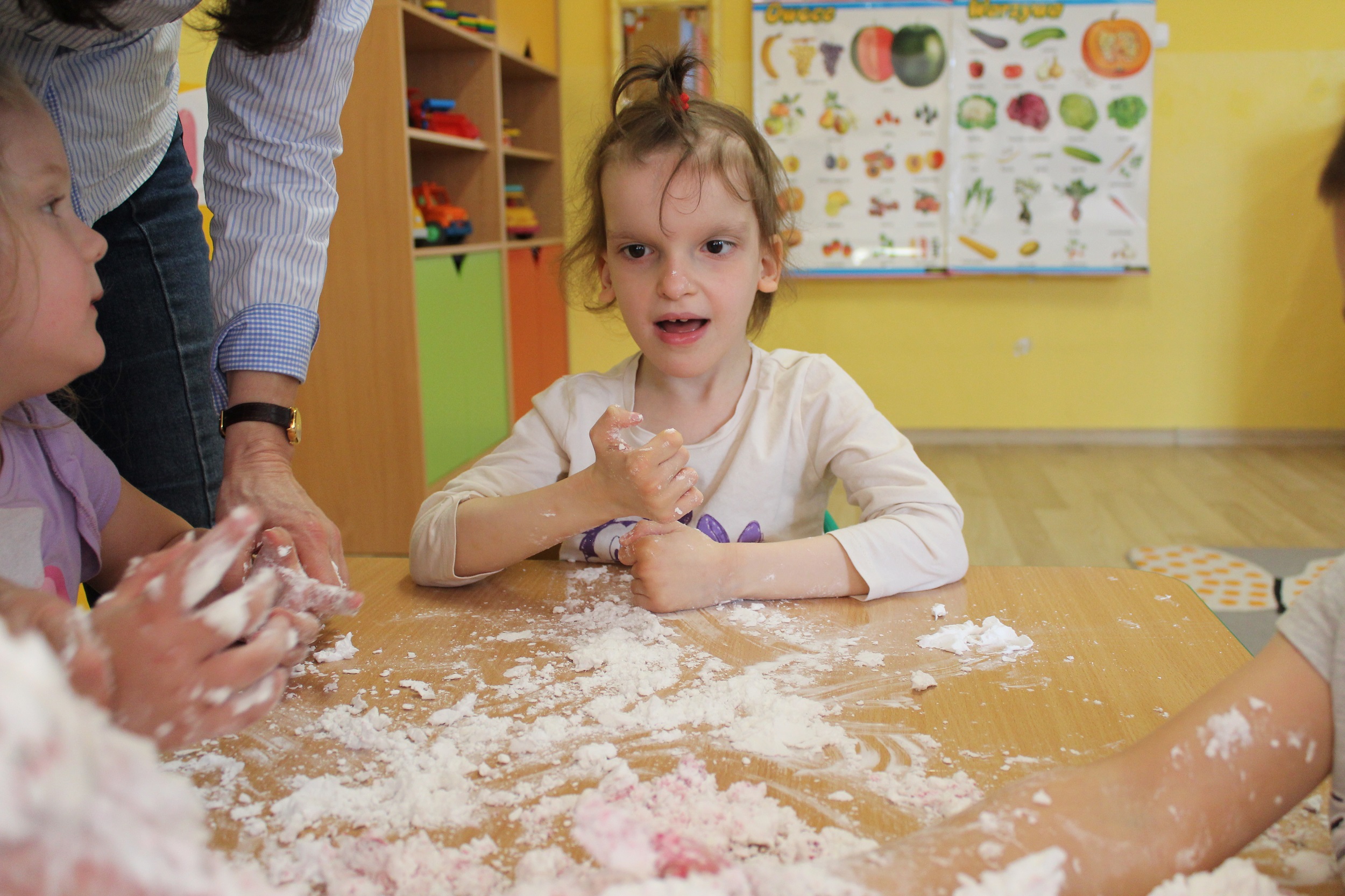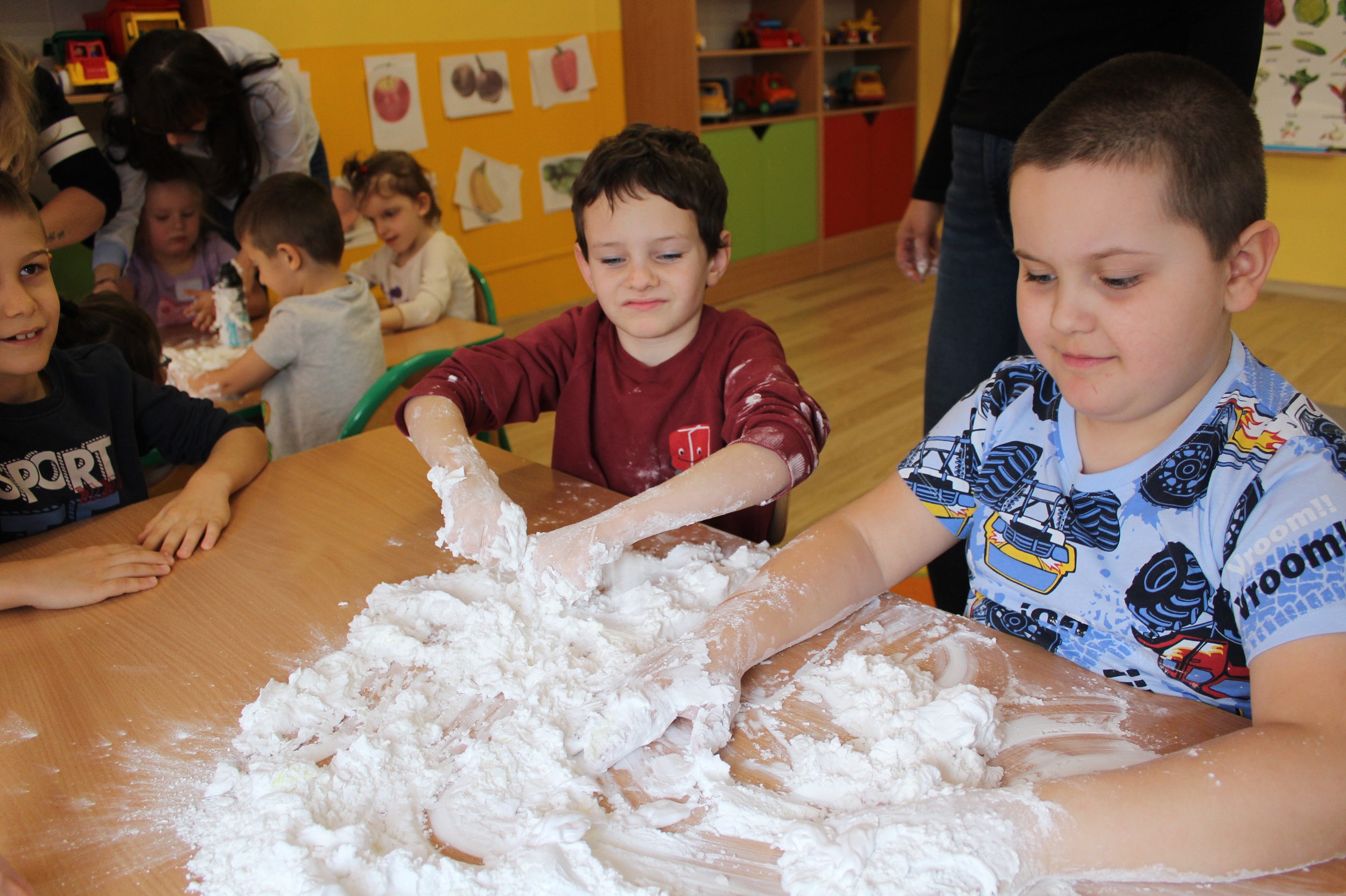 W środę skupiliśmy się na tym, co jemy. Rozpoznawaliśmy i nazywaliśmy owoce i warzywa, poznaliśmy je wszystkimi zmysłami: dotykając, wąchając, smakując. Natomiast masażyk „Kuchareczka” dostarczył nam dużo relaksu i radości. Nie zabrakło również zabaw ruchowych do piosenek o zdrowym jedzeniu, które utrwaliły temat dnia.